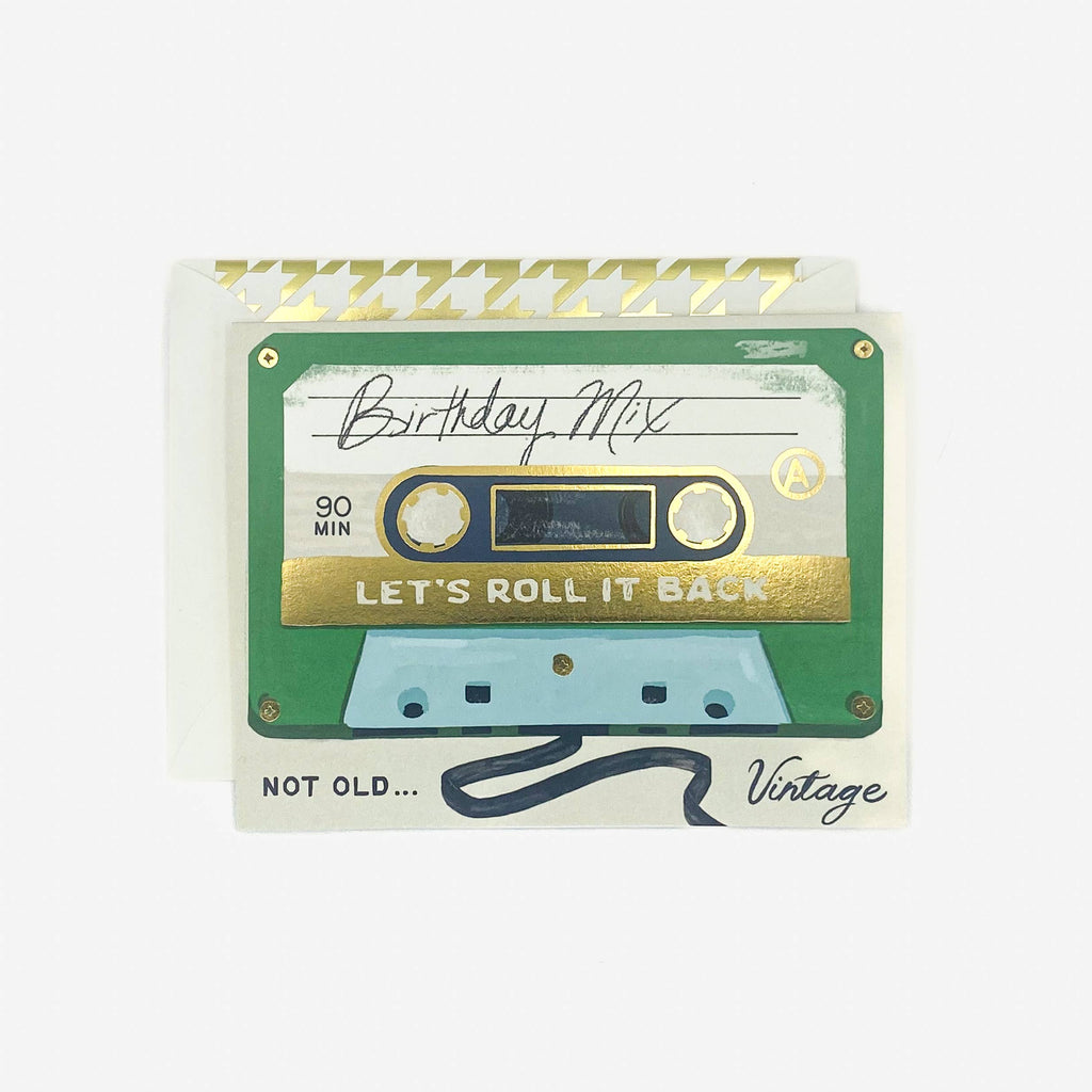 Cassette Tape Greeting Card “Let’s Roll it Back” A2, foiled White envelope with Gold Foiled Houndstooth Liner