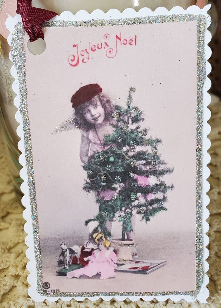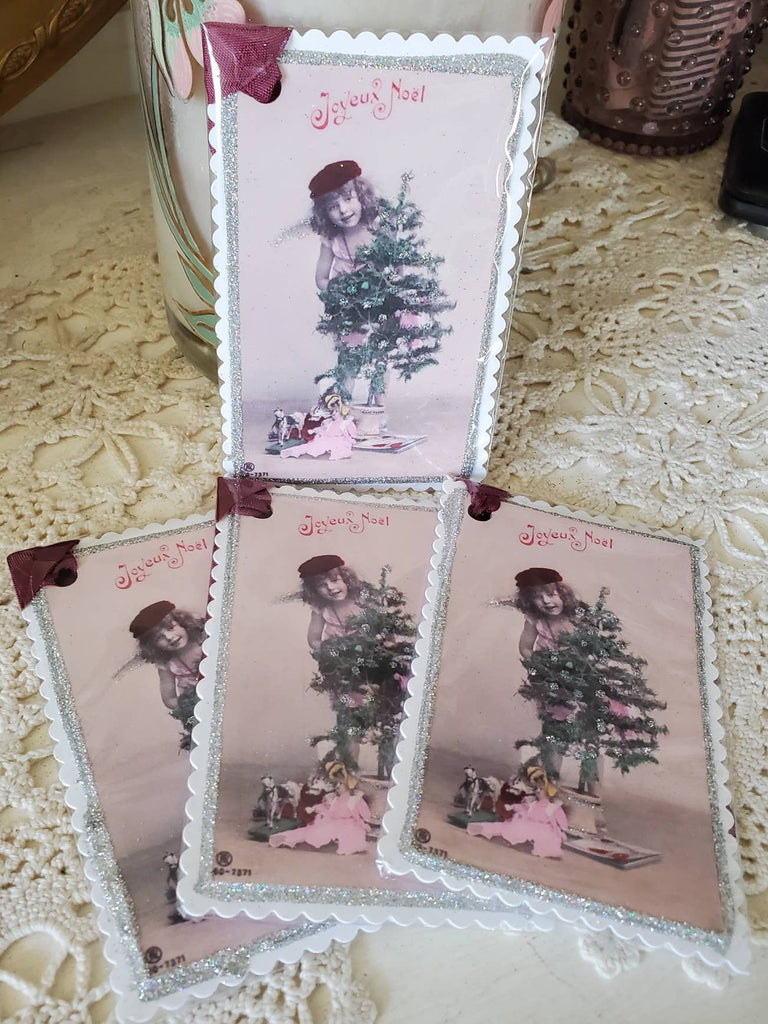 This is a lovely vintage postcard of a Christmas angel n tree gift tag with just the right amount of glitter bling and it reads: Joyeux Noel. Perfect to add to a special gift or it becomes the gift. Our tags are made with heavy cardstock and are four layers thick so they are very durable. They come individually wrapped.
