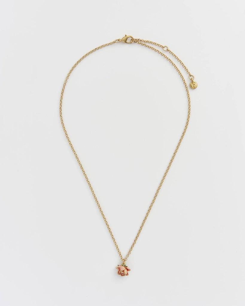 Indulge in the delicate beauty of this one-of-a-kind necklace, featuring a hand-carved rose charm inspired by the exquisite botanical illustrations of Dr. Robert John Thornton. The intricate detailing and vibrant colors of the enamel paint beautifully capture the natural elegance of the timeless flower, truly making this necklace a remarkable work of art. The vintage-inspired charm and feminine aesthetic of this necklace make it an absolute must-have for those who adore and appreciate nature, art, and timeless style. To add a touch of whimsy and elegance to your display, consider pairing this necklace with the matching bracelet and huggie earrings. Key features: Hand-painted enamel Hand-carved detailing Pendant: 22ct Worn-gold plated brass, zinc alloy, enamel Chain: 22ct Worn-gold plated brass 41cm (16"") Chain with 5cm (2"") extender; Pendant: 8mm height x 11.7mm width Wipe clean with a soft cloth Comes in a gift box with a cotton pouch