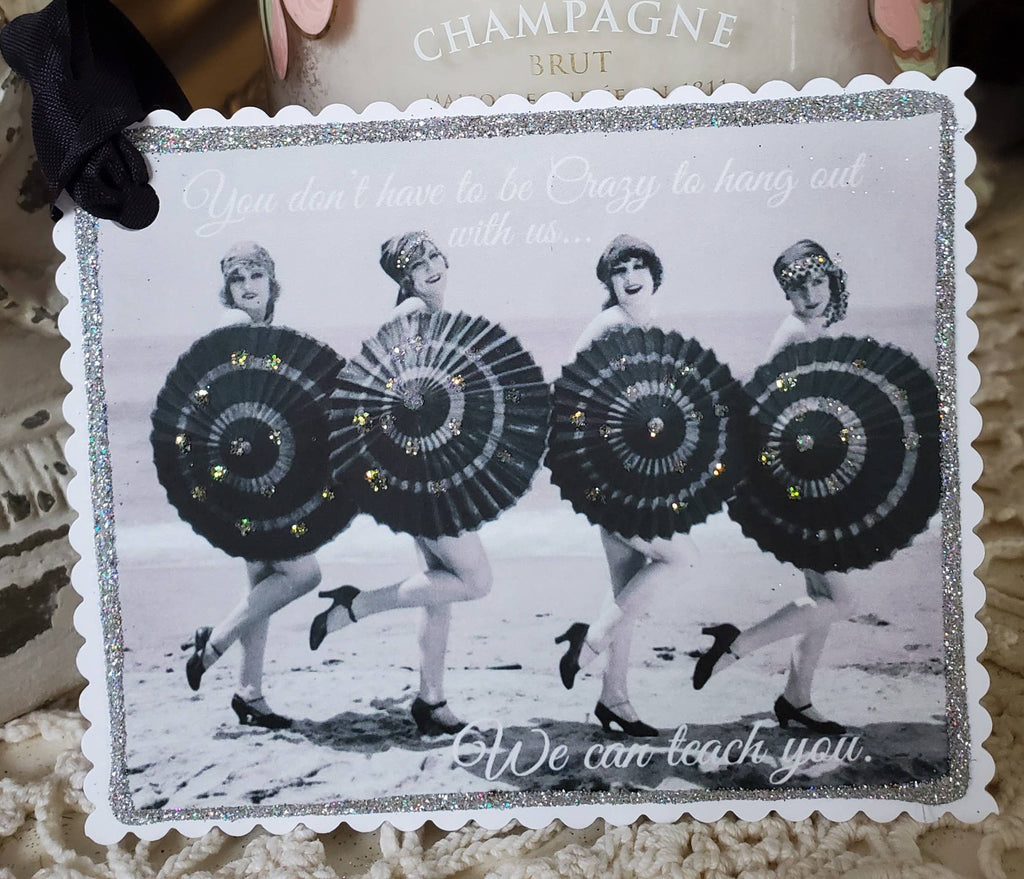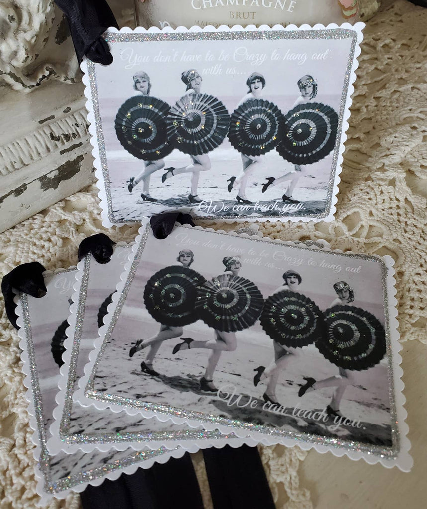 This is a fun vintage image gift tag with just the right amount of glitter bling and it reads: You don't have to be Crazy to hang out with us. We will teach you. Perfect to add to a gift or it is the gift. Made with heavy cardstock it's four layers thick so they are very durable. They come individually wrapped.