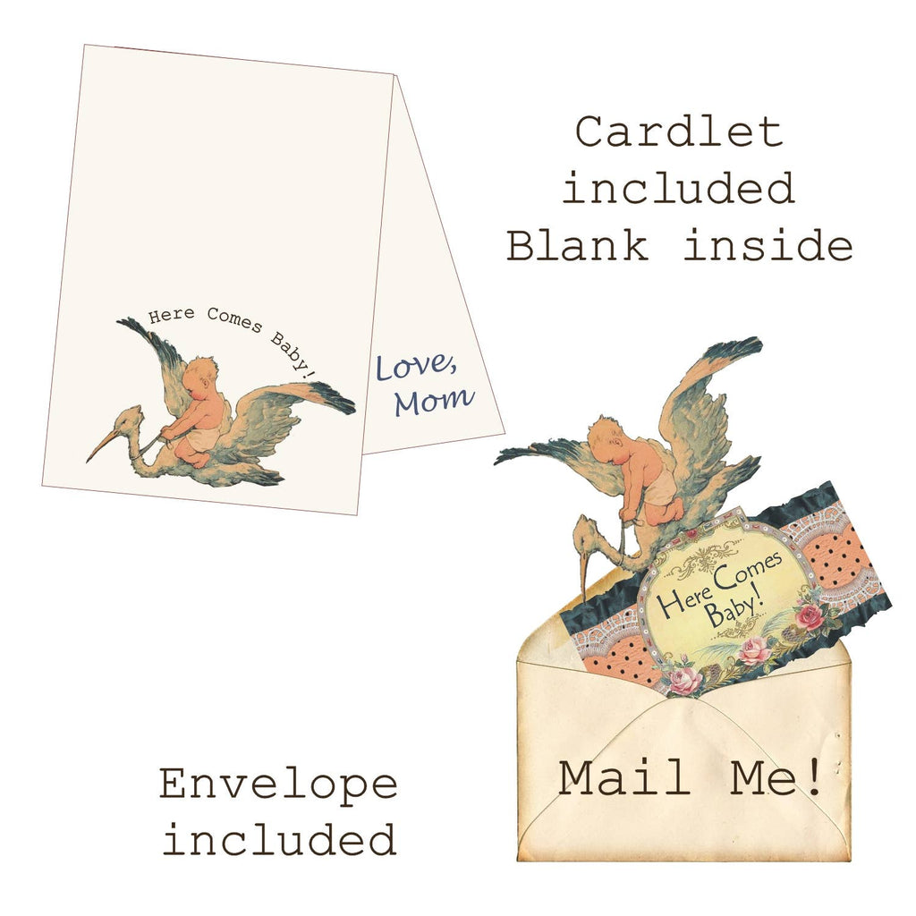 • Greeting Card with Tiara, Here Comes Baby, Stork