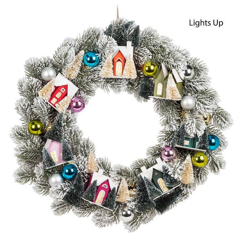 Elevate your holiday decor with our Large Wreath with LED Pastel Houses, a whimsical and enchanting addition. This flocked wreath showcases charming pastel-colored houses adorned with warm LED lights. Measuring approximately 18 inches, it creates a festive and inviting ambiance, perfect for welcoming the holiday spirit. Embrace the magic of the season with this artfully crafted and illuminated pastel house wreath.