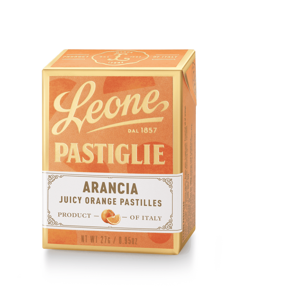 Pastiglie Leone's Candy Originals are the Company's oldest and most distinctive confectionery product. These small delights are the result of a careful choice of essences, extracts and herbs to enhance the fragrance and scent of the various different flavors. Their pleasant pastel shades (made from natural ingredients) make this product alluring to the eye as well as to the palate. Ingredients: Sugar, Arabic gum, tragacanth, orange juice, natural flavors, tartaric acid, and cochineal extract.