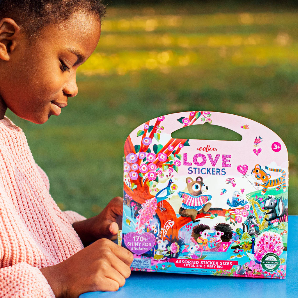 This sweet array of love-themed stickers in 3 sizes will inspire imaginative sticker-play for all ages. Perfect for Valentine's Day or whenever cupid's arrow strikes. Featuring cheerful and vibrant illustrations by Linda Bleck, each sticker is embellished with shiny rainbow foil for added sparkle! •12 pages of over 200 shiny stickers •Promotes Screen-Free, Self-Directed, Imaginative Activity •Includes three sticker sizes: Little, Big, and Very Big •Sustainably Sourced: Made with recycled materials and printed on FSC®-certified paper using vegetable-based inks. •Sticker Book: 8" x 8"