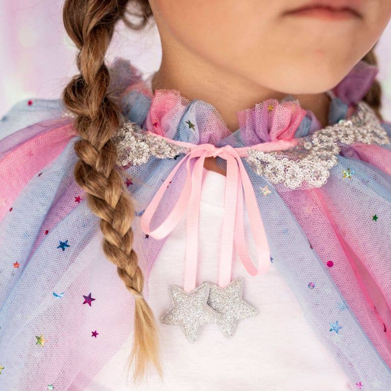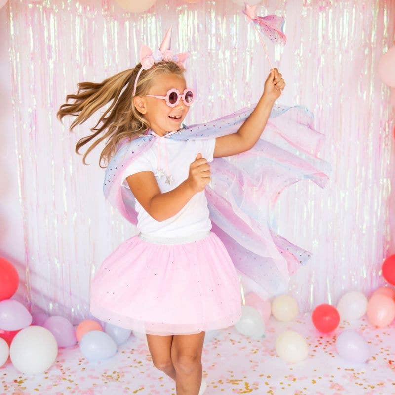 Sweet Wink dress up kits include everything a little one needs for the ultimate dress up ensemble. It makes a great Halloween costume or the perfect holiday gift for any child who loves unicorns! Capes are made with super soft tulle (that doesn’t scratch or itch!) and paired with a matching wand and hair accessory. Includes: 1 Cape 1 Wand 1 Unicorn Headband Cape Features: Adjustable necktie Ages 3 years old & up Dimensions: Neck-14 inches, Length-28 inches Care: Hand wash only - do not iron, tumble dry, bleach, or dry clean