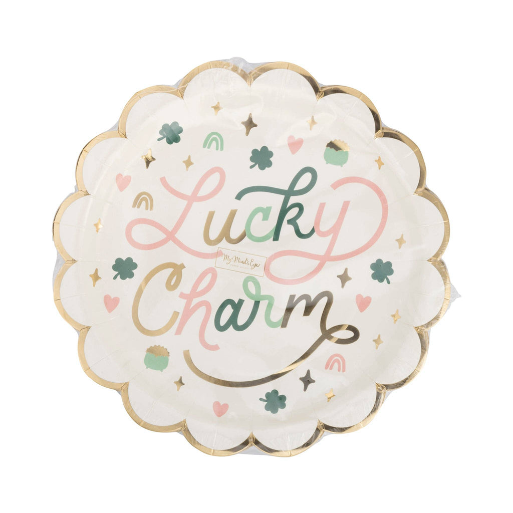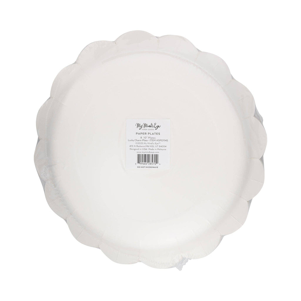 Channel the luck of the Irish with our Lucky Charm Plate! Made from sturdy paper, this plate features a festive lucky charm design to bring you good fortune while you dine. Perfect for adding a playful touch to your next celebration! • includes 8 scalloped paper plates • 10 x 10 inches • gold foil 3 sets of plates make 1 wholesale pack.