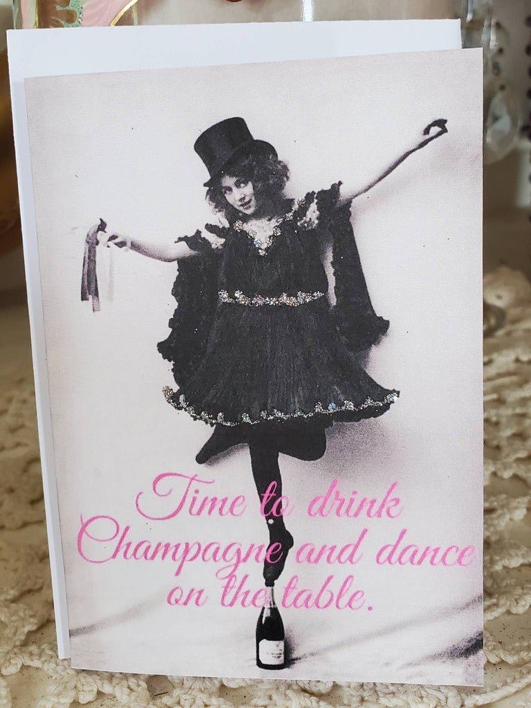 This is a fun vintage image girl standing on a Champagne bottle mini greeting card and it reads: Time to drink Champagne and dance on the table. It has just the right amount of glitter bling. Made with cards stock, it is a mailable size and is blank on the inside. They come individually wrapped.