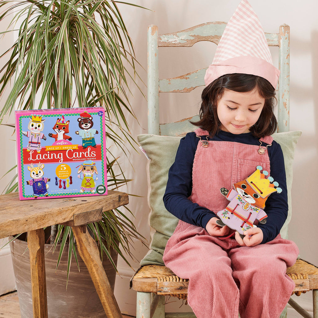 Woodland Friends Lacing/Sewing Cards. Five (5) Sweet and fanciful, die-cut animals come with easy to lace-on outfits. Sturdy die-cut boards feature adorable animals to dress while safely developing basic sewing skills. •Age 3+ •Inside the Box: 5 Extremely sturdy 9" die-cut Animals, 5 outfits (10 piece), and five 5 25" beautifully dyed laces •Each shaped animal is approximately 8 inches by 5 inches •Sustainably Sourced: Made with recycled board and printed on FSC®-certified paper using vegetable-based inks